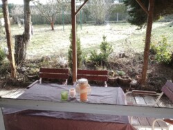 Der Garten Nr. 10 (im Plan gelb markiert) verfügt über ein Häuschen aus Stein mit einer überdachten angenehm schattigen Terrasse, einem kleinen Vorraum, Wohn-/Schlafraum, kleine Küche und kleines Bad. Wie alle unsere Gärten hat auch dieser Strom und Wasseranschluss. Dazu gibt es am Haus noch kleine Nebengelasse. Die Gartenfläche an sich ist schön angelegt mit teilweise altem Baumbestand und einem Schaukelgerüst.
